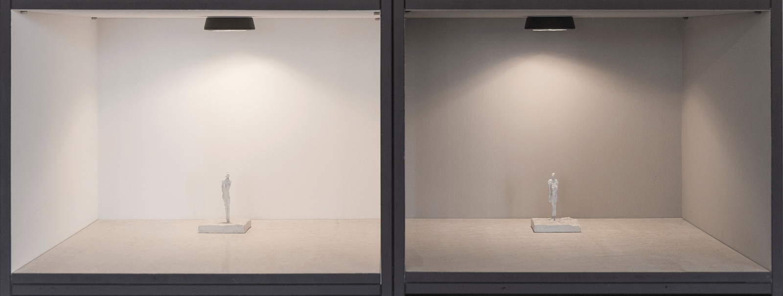 Zwei identisch ausgestattete und belichtete Räume, nur die Hauptfarbe ist verschieden. Links die Industriefarbe NCS 0500-N, rechts kt.COLOR Dämmergrau. In welchem Raum sehen Sie die Figur besser? ©Philipp Haas, 2019