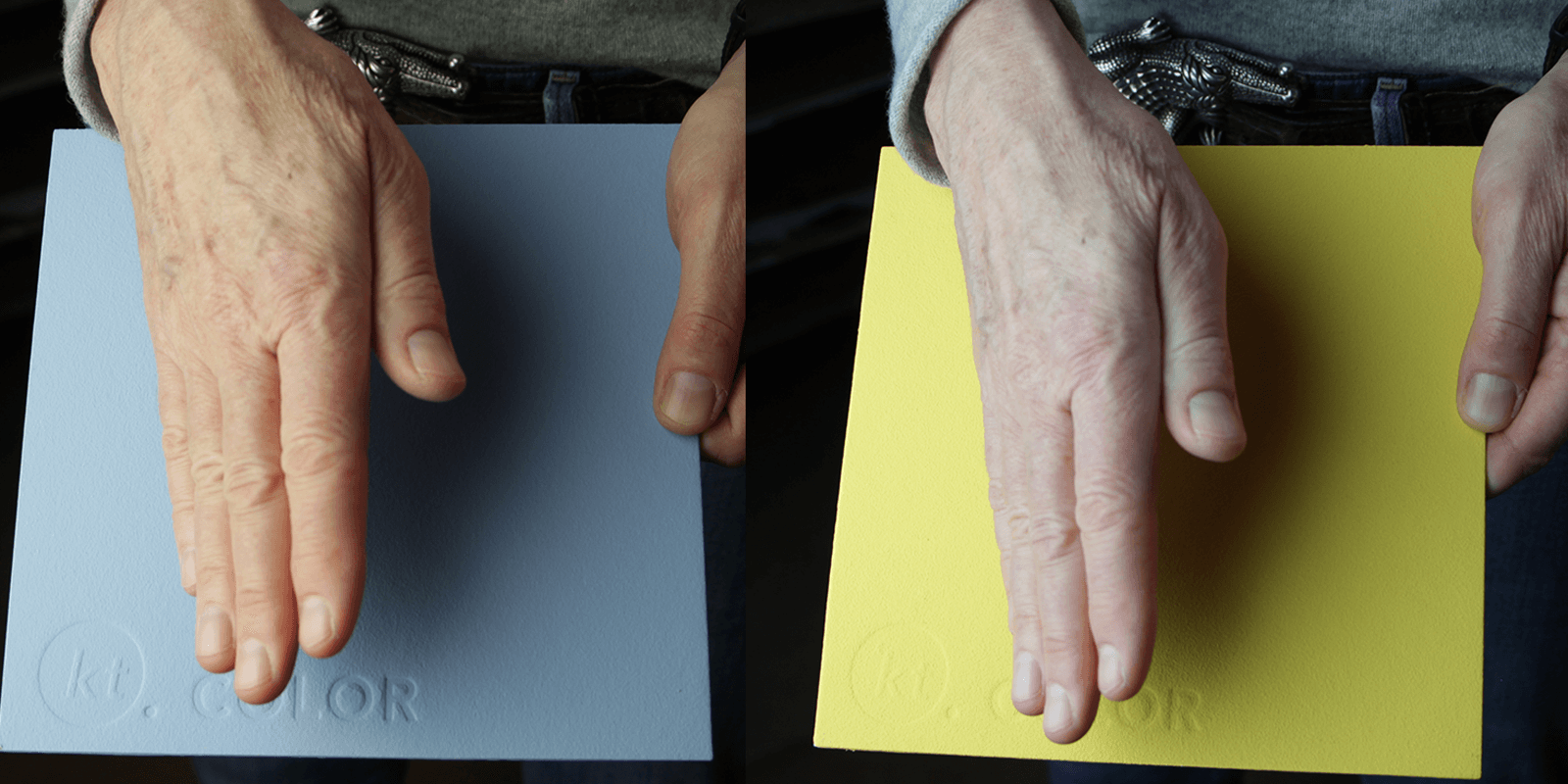 Aufnahmen unbearbeitet. Links dominieren blaue Reflexionen den visuellen Raum zwischen Auge und Hand. Der Sehsinn verschiebt alle Eindrücke gegen die Komplementärfarbe Orange. Rechts dominieren gelbe Reflexionen im visuellen Raum und der Sehsinn verschiebt alle Eindrücke gegen Komplementärfarbe Grau. ©kt.COLOR